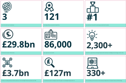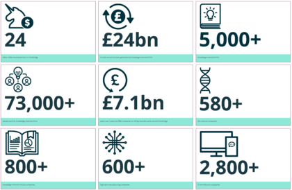 The University of Cambridge is a world leader in research and innovation and the Cambridge Academy of Therapeutic Sciences has been established to maximise these strengths across the therapeutics landscape. The Cambridge Innovation in Numbers and Cambridge Research in Numbers infographics show the success of the Cambridge cluster and the University's role within it.